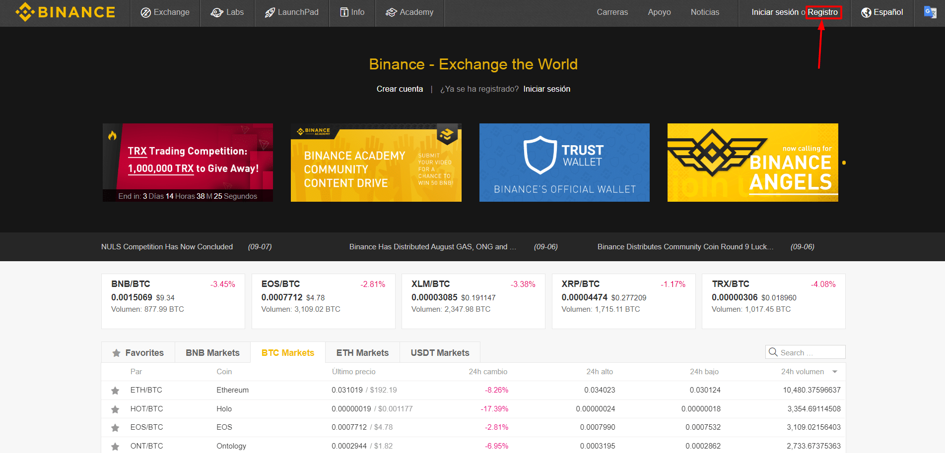 Lo primero de todo es ir a la web de Binance para registrarse.