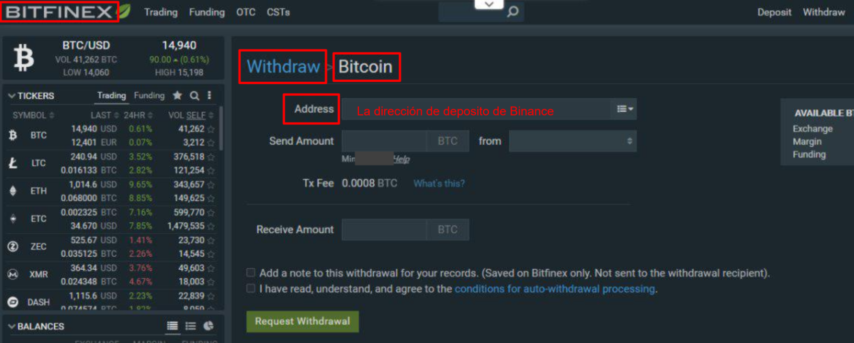 Por ejemplo, si quisiésemos depositar en Binance mediante Bitfinex, deberíamos introducir en el apartado de Address de Bitfinex, la dirección que nos proporciona Binance para la criptomoneda que nos interesa depositar en Binance.