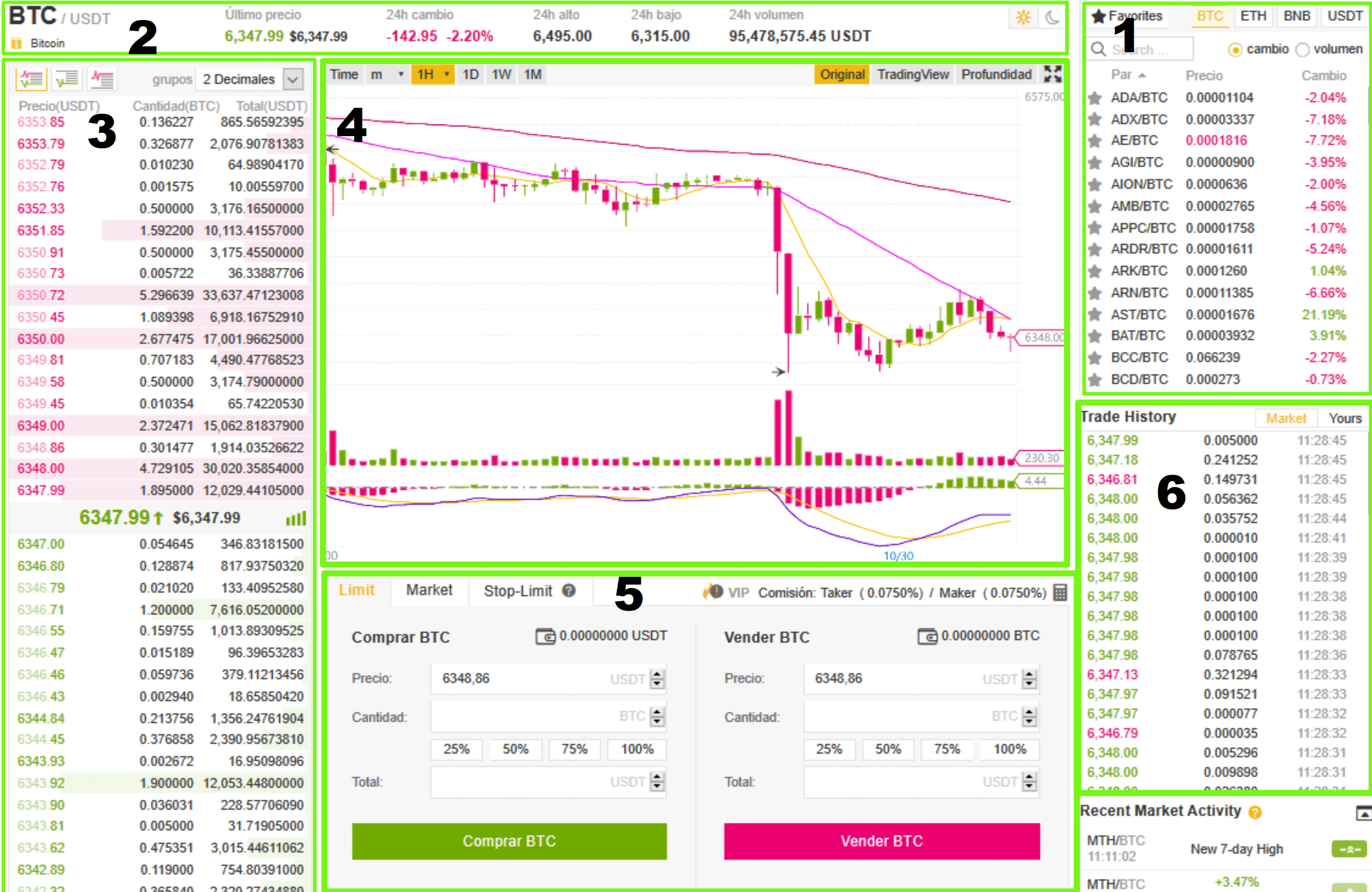 1) Arriba a la derecha tenemos los cuatro mercados con los que Binance nos permite operar. Tenga en cuenta que no todas las criptomonedas están disponibles para ser compradas en los 4 mercados. Bitcoin es el mercado con más criptomonedas disponibles para tradear.