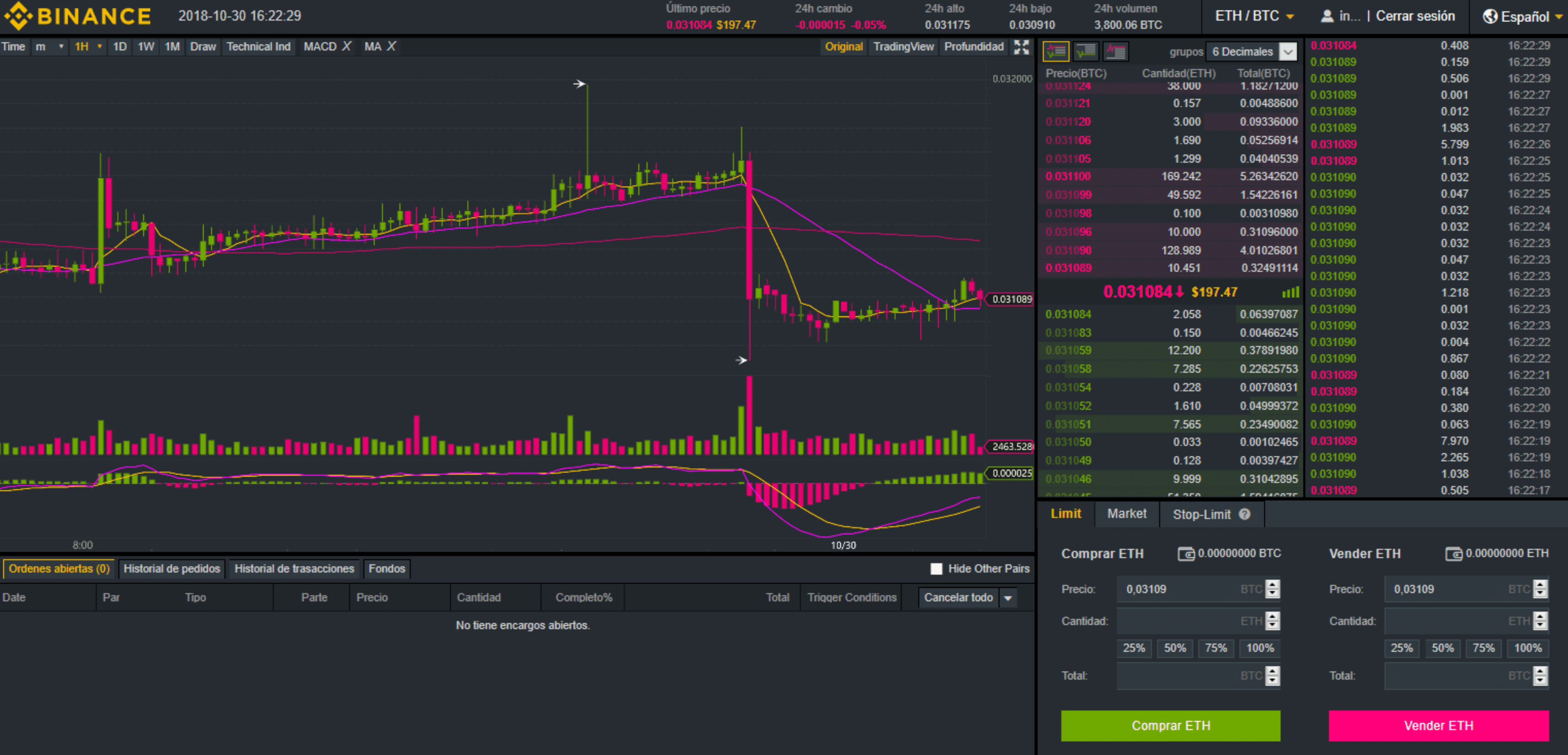Aunque la interfaz avanzada nos ofrece herramientas y datos para realizar un análisis técnico más detallado, la funcionalidad final de ambas interfaces es la misma, y por tanto podemos tradear sin problema con la interfaz básica. Así luce la interfaz básica en Binance: